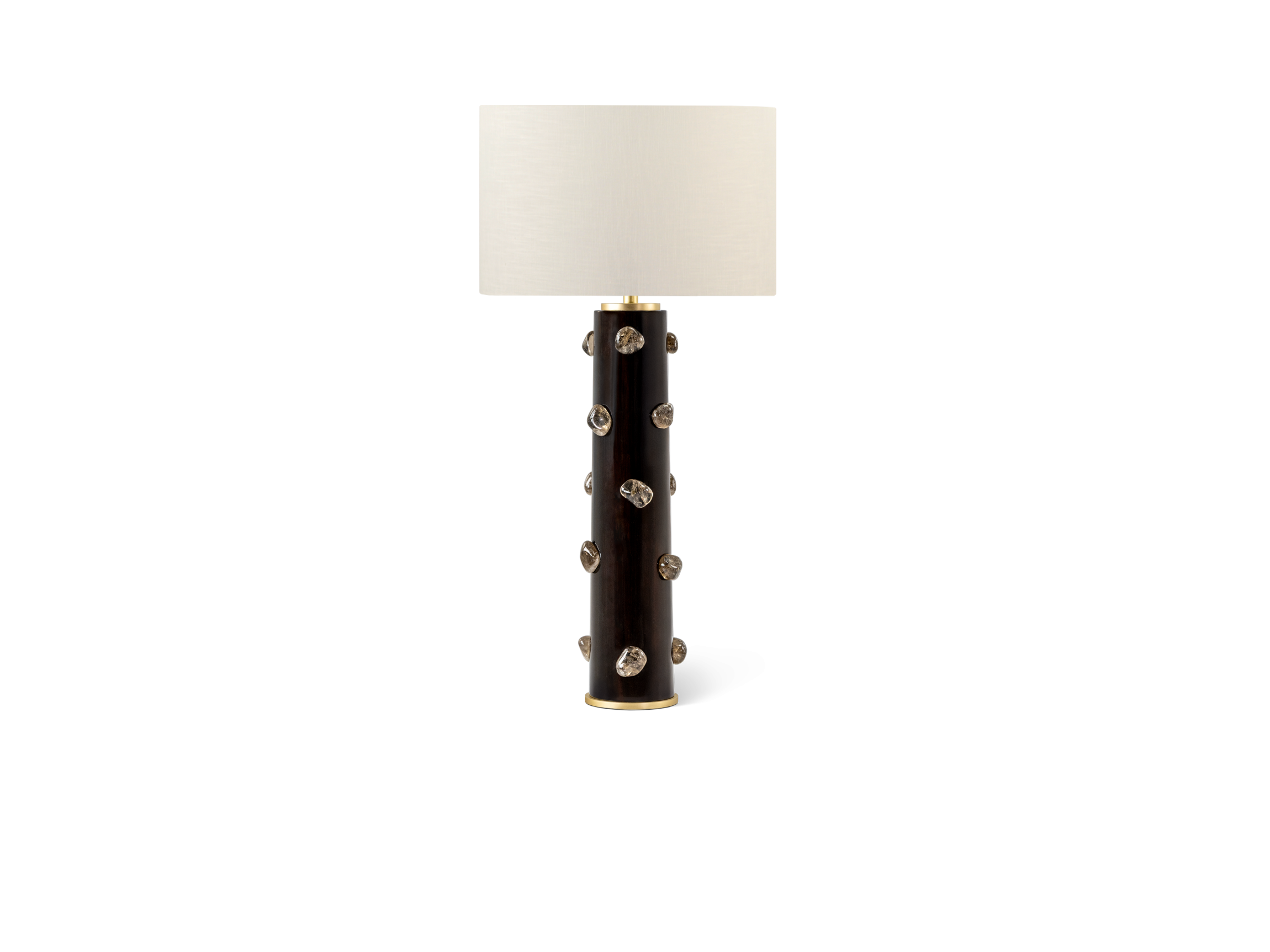 Table lamp in high gloss ebony wood and brushed brass base. Adorned with fifteen tumbled quartz smoky stones*.