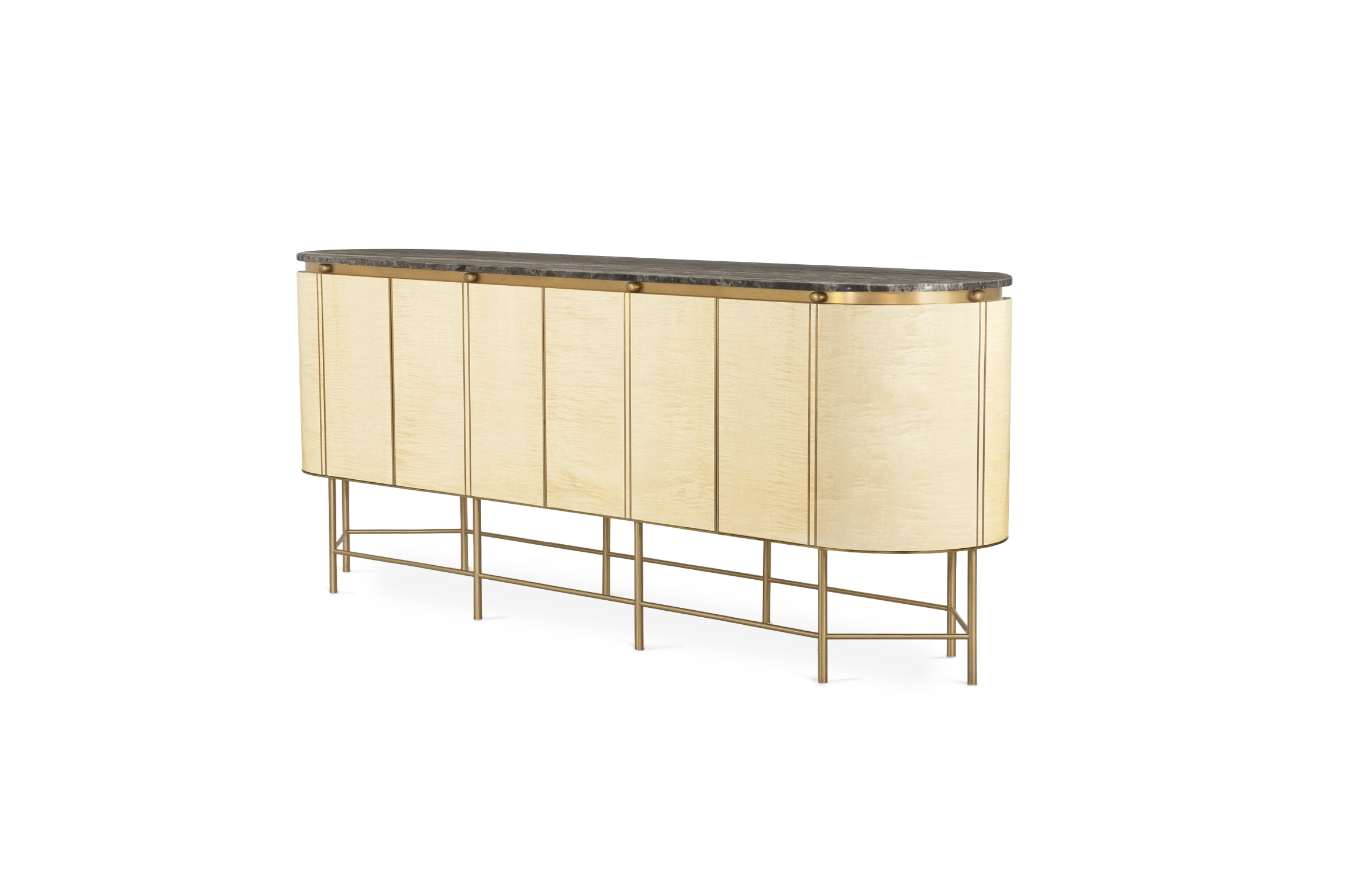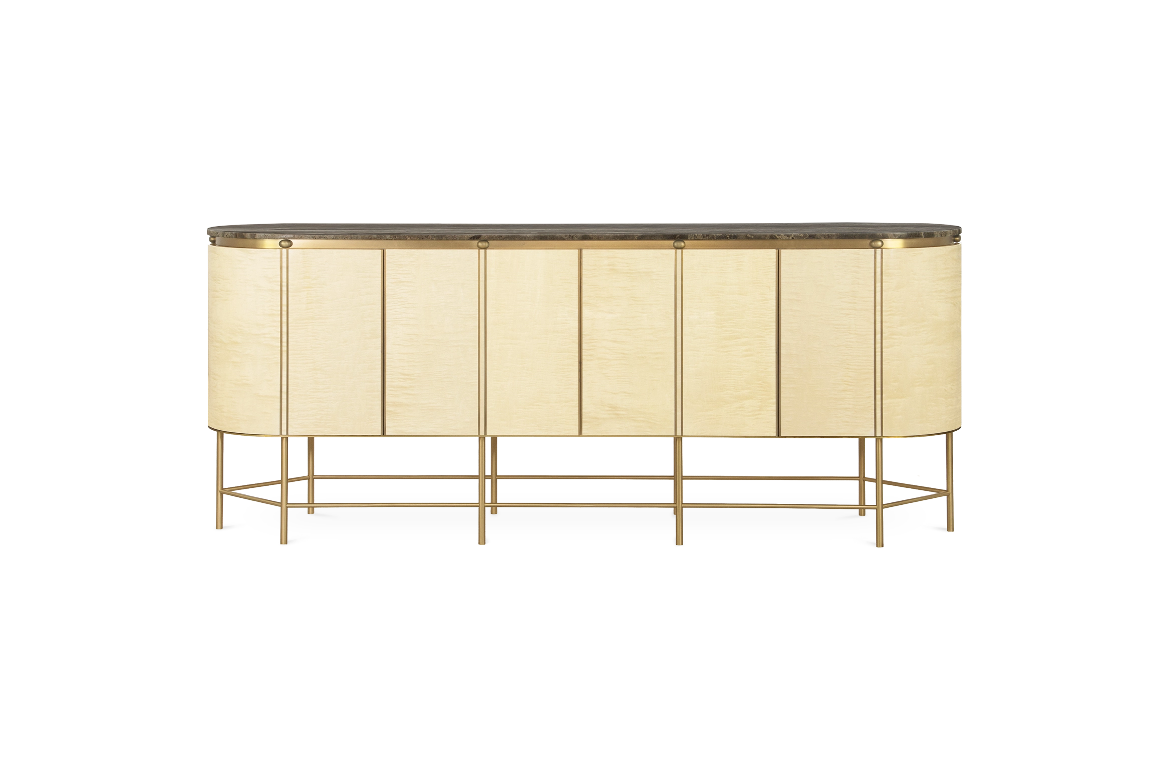 A four door round sideboard in sycamore wood with high gloss finish, structure and details in oxidized french brass. Dark silver travertino tabletop. Dark silver travertino tabletop.