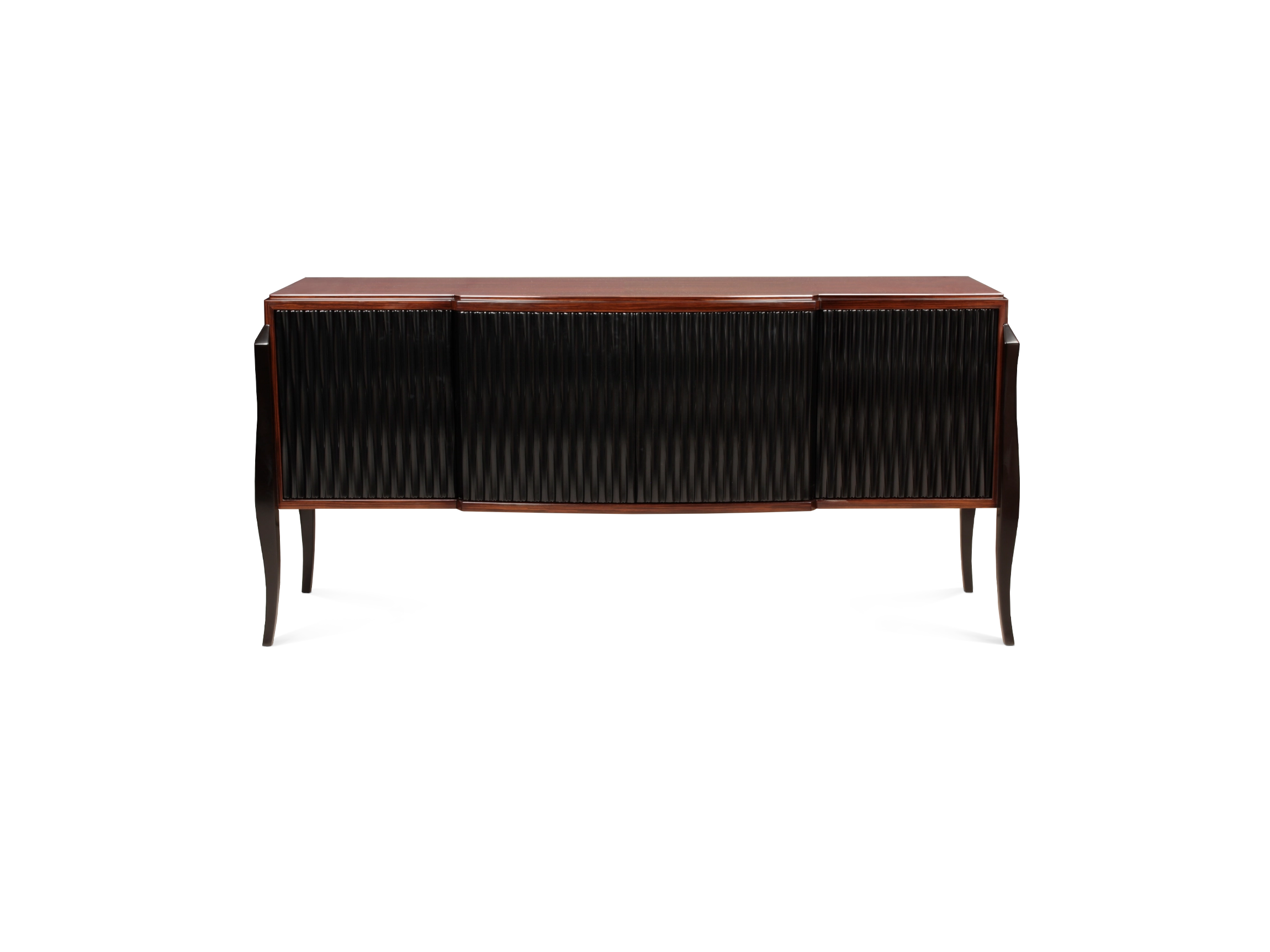 O aparador Piece by Piece desenrola-se como um diálogo entre a elegância clássica e a sensibilidade moderna. A sua estrutura em ébano, rica em tonalidade e presença, envolve portas lacadas pretas esculpidas que ondulam com um movimento subtil, captando a luz em reflexos que se insinuam delicadamente. Apoiado em pernas suavemente curvadas, encarna equilíbrio e força serena.