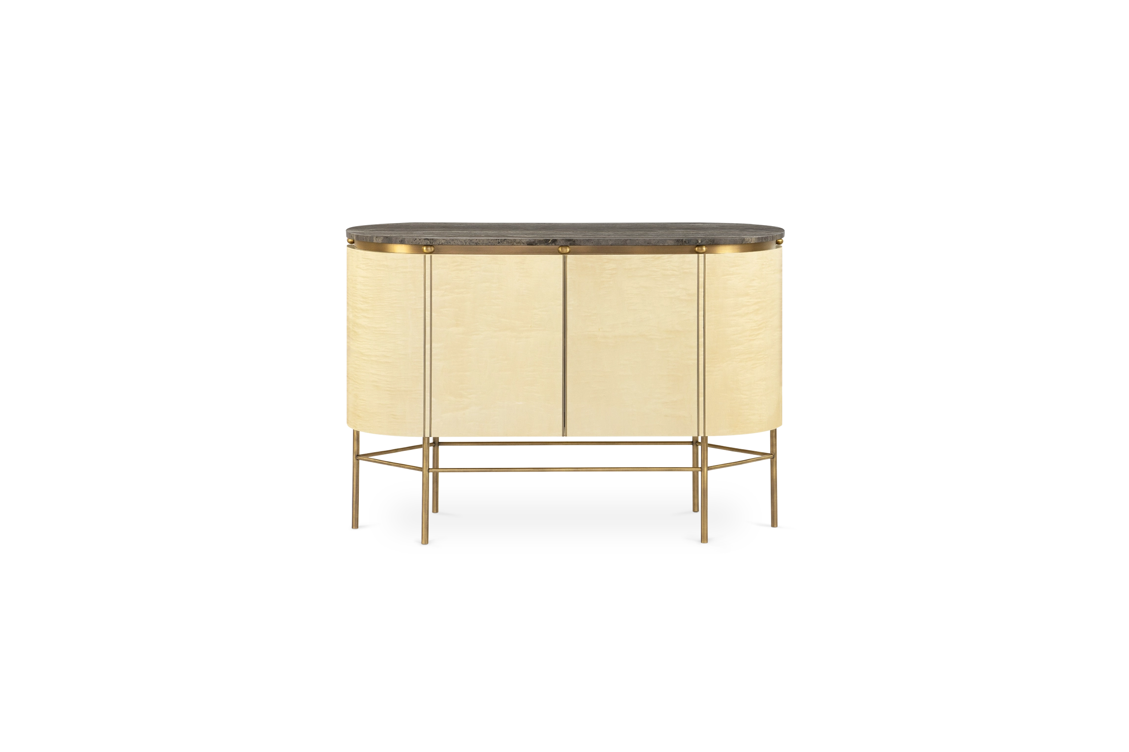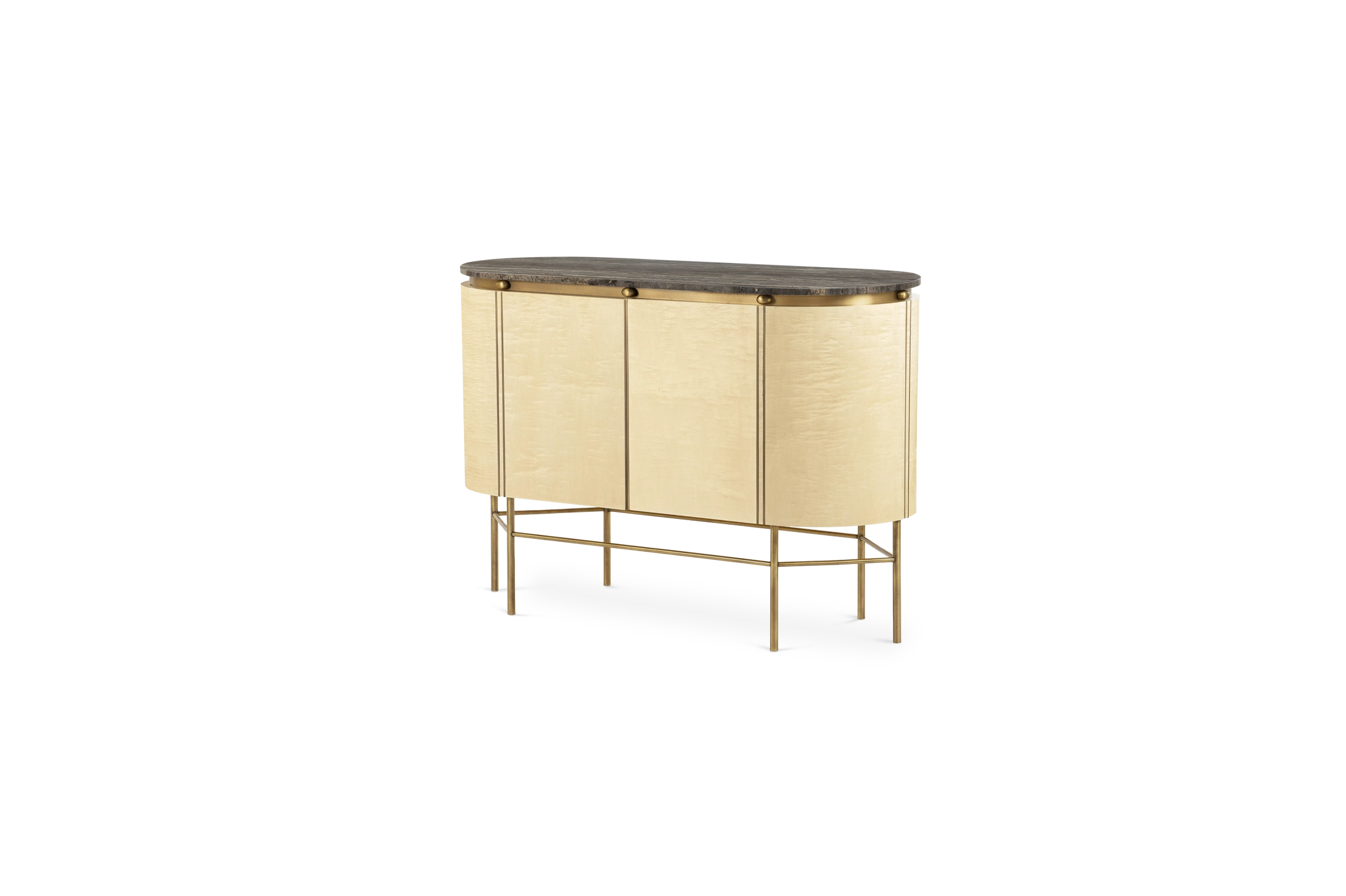 Armário redondo de duas portas em madeira de sicómoro com acabamento de alto brilho, estrutura e detalhes em latão francês oxidado. Tampo em travertino prateado escuro.