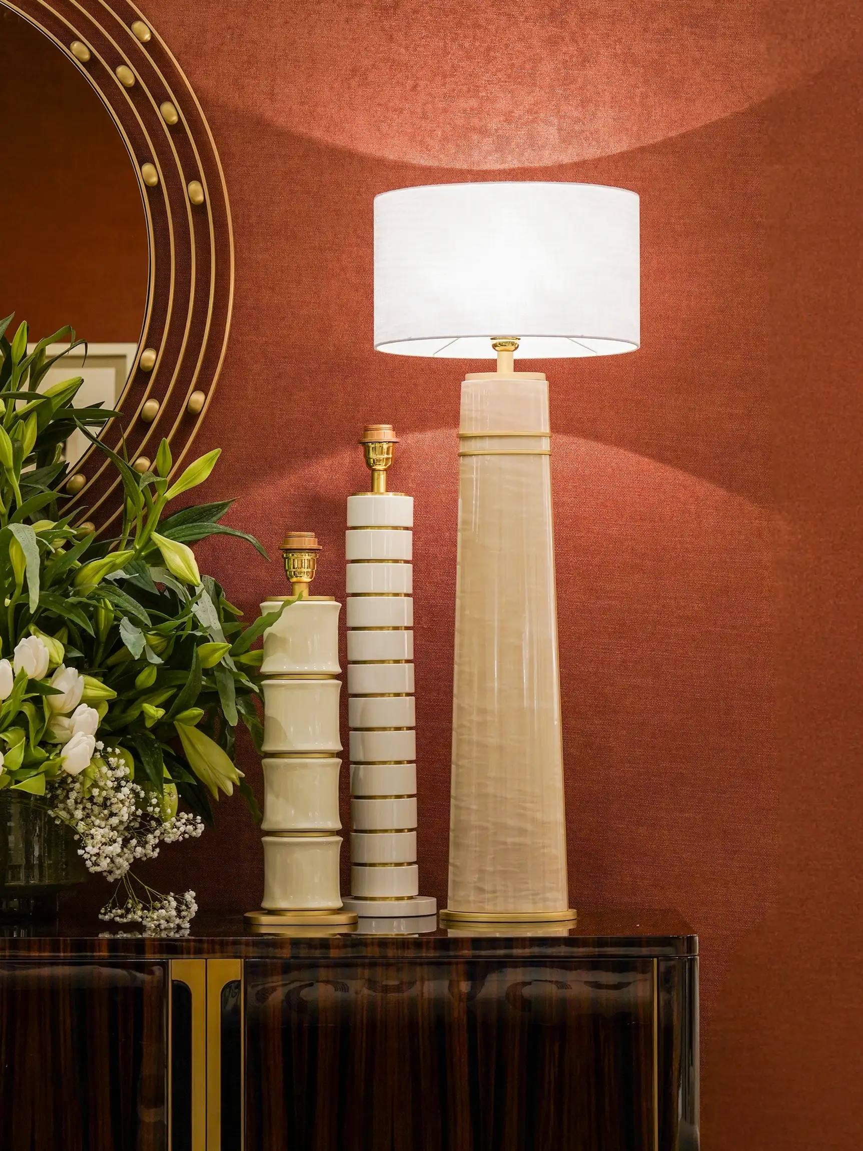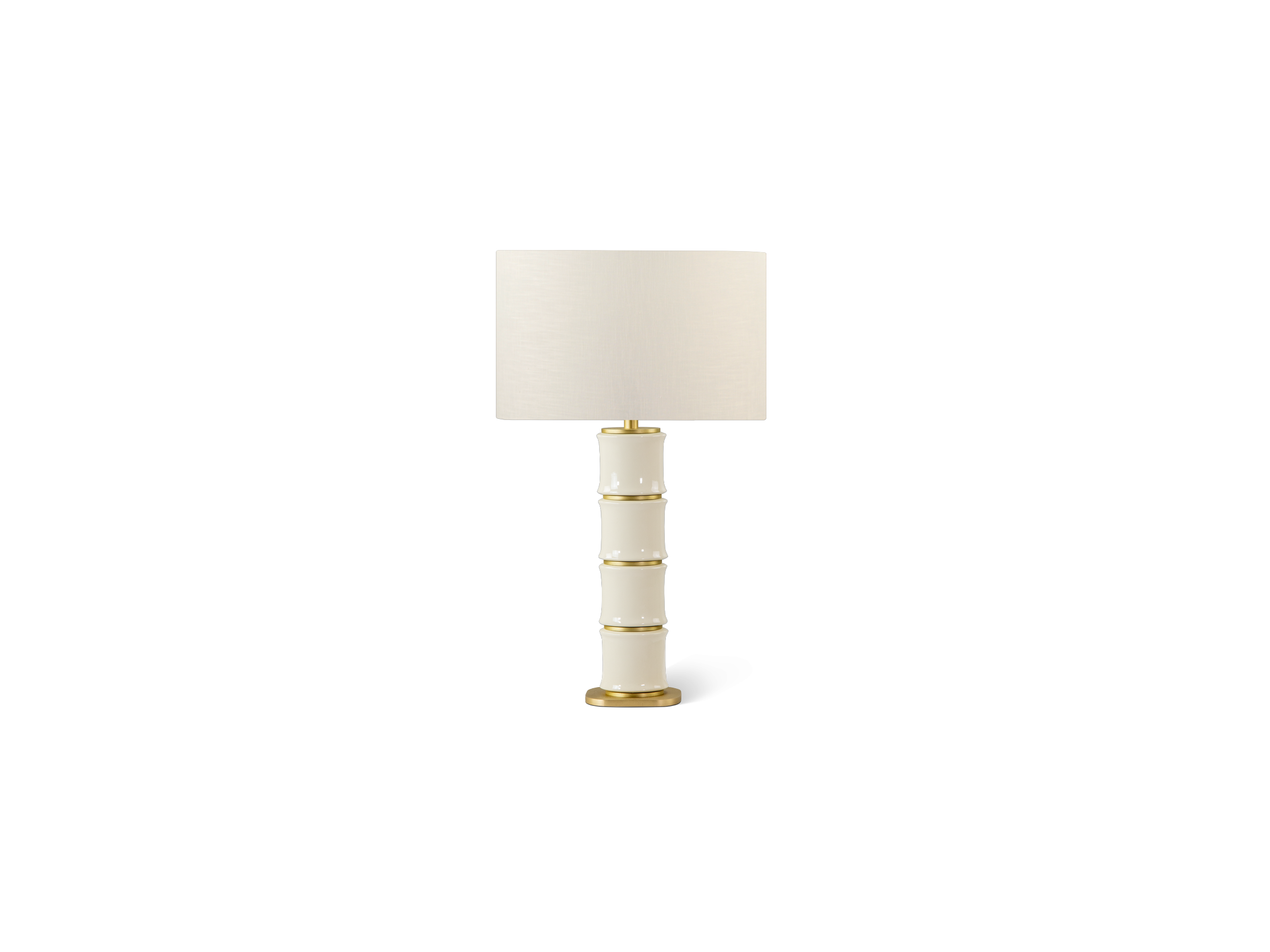 Luminária de mesa lacada com base e detalhes em latão escovado.